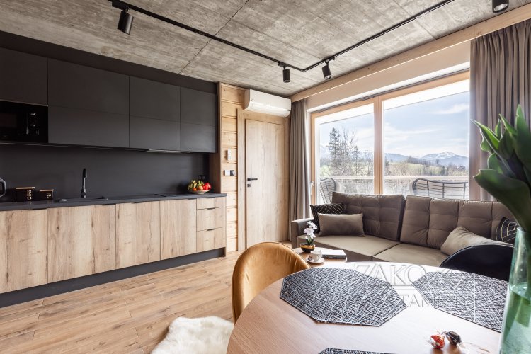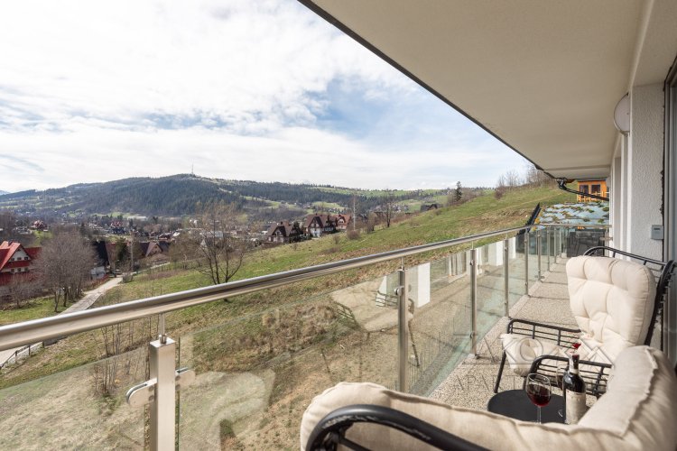 Struktura: przedpokój z szafą, salon z aneksem kuchennym i KOMINKIEM, sypialnia, balkon: jedno wyjście z salonu z widokiem na GÓRY, drugie z sypialni z widokiem na Gubałówkę, przedpokój z dużą szafą, łazienka. Klimatyzacja.