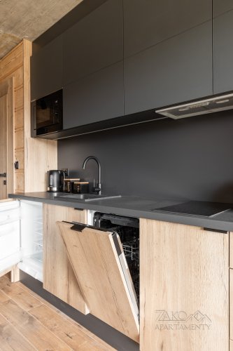 Kuchnia: płyta indukcyjna (2 palniki), zmywarka, lodówka, zlewozmywak, mikrofalówka, czajnik elektryczny